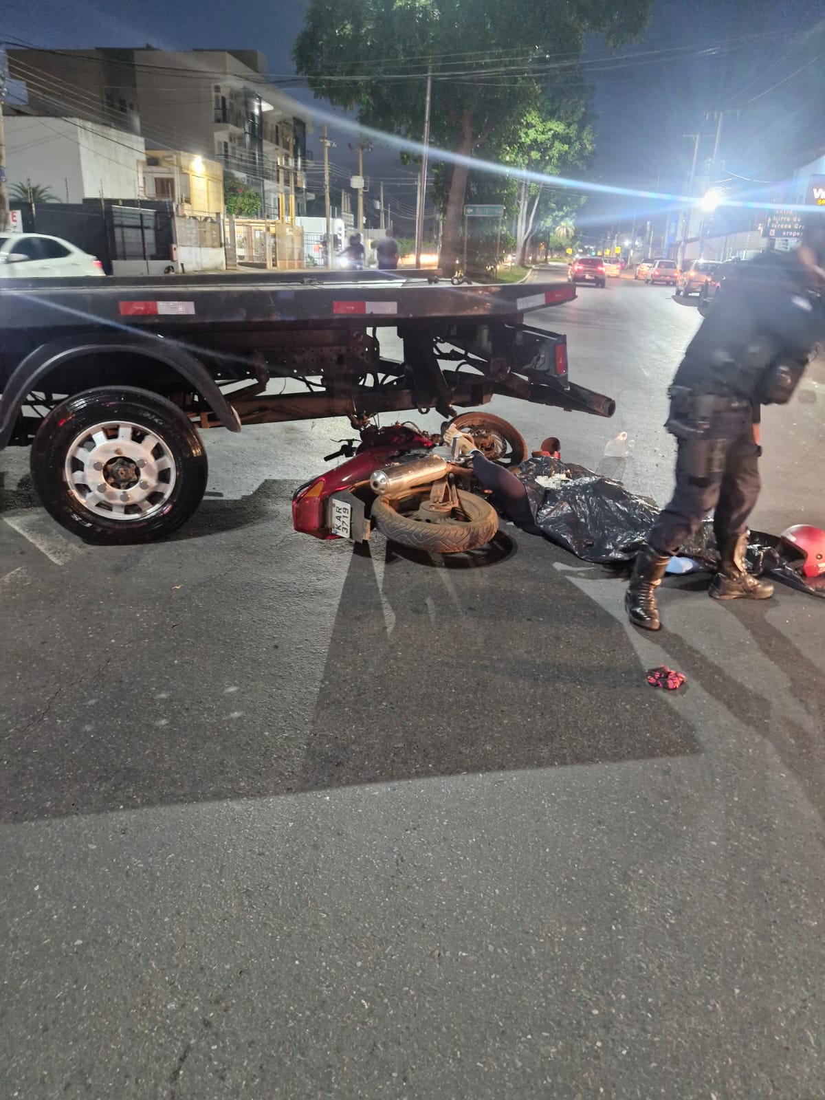 Aconteceu uma Colisão entre uma motocicleta Yamaha e um caminhão-guincho por volta das 18h40, nas proximidades da Escolinha do Cuiabá.