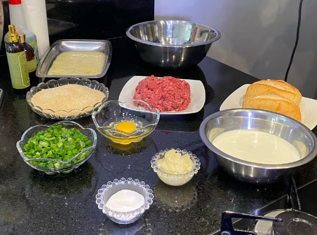 Numa vasilha molhe o pão francês no leite, depois em uma tigela, misture a carne moída com o pão molhado, alho, a cebola, o cheiro-verde, a pimenta-do-reino e o sal. Adicione o ovo e misture bem.