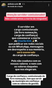 “Atenção, servidor comissionado! Não celebramos a morte de ninguém! O servidor em cargo comissionado (de livre nomeação, cargo de confiança) que comemorar a morte de Charlie Kirk, que publicar em redes sociais ou em WhatsApp, mensagens em desrespeito a sua memória, será exonerado do cargo de confiança”, escreveu Abilio.